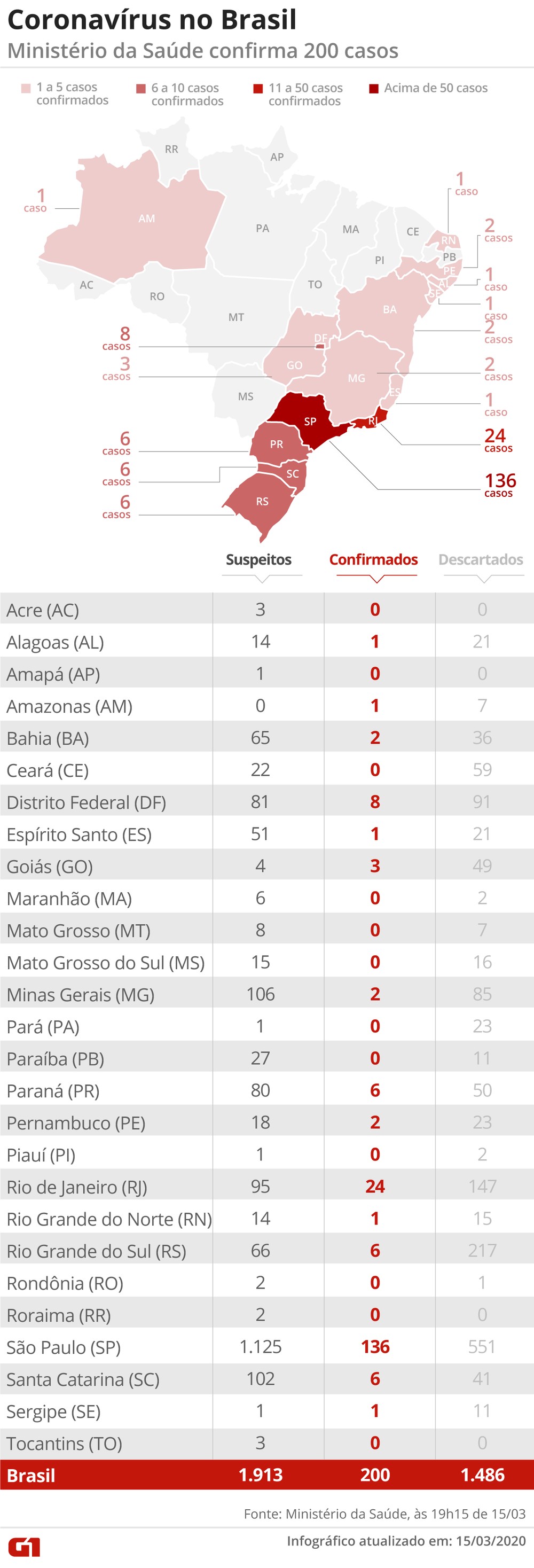 O Ministério da Saúde divulgou neste domingo (15) novo balanço dos casos confirmados de novo coronavírus (Sars-Cov-2) no Brasil: são 200 casos. Além disso, o balanço tem os seguintes destaques: