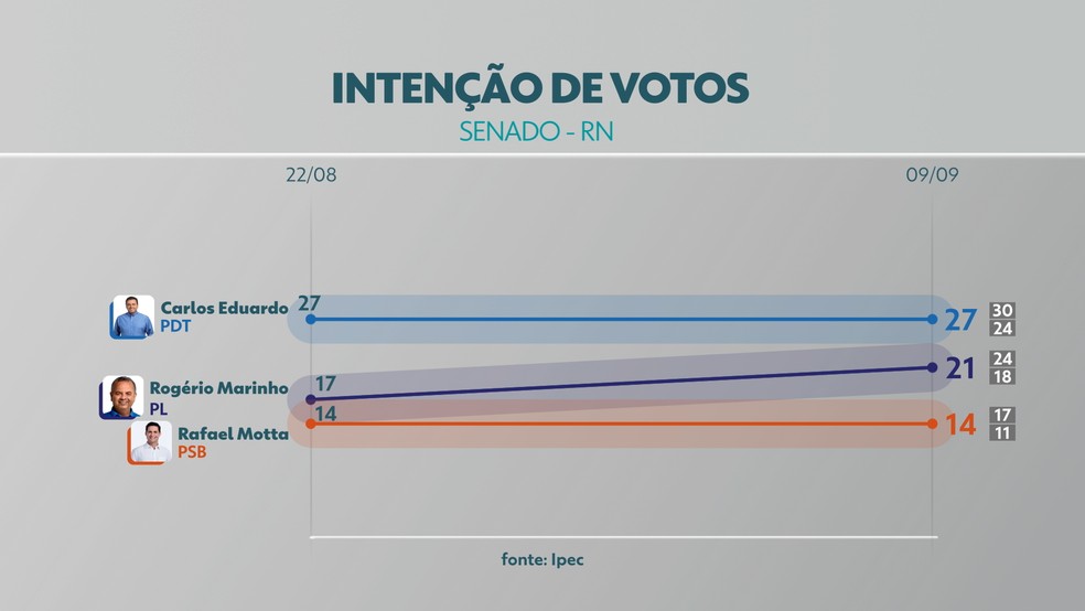 Ipec para o Senado no RN: Carlos Eduardo tem 27%, Rogério Marinho 21% e Rafael Motta 14% das intenções de voto — Foto: Arte