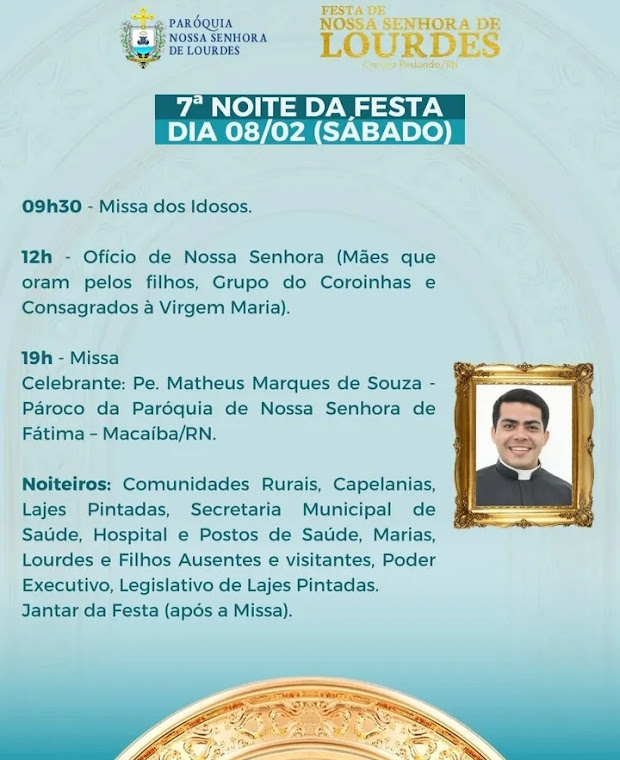 08/02 (Sábado): Jantar de Nossa Senhora de Lourdes e Leilão da Festa - Atração musical: Kamarguinho Mendes