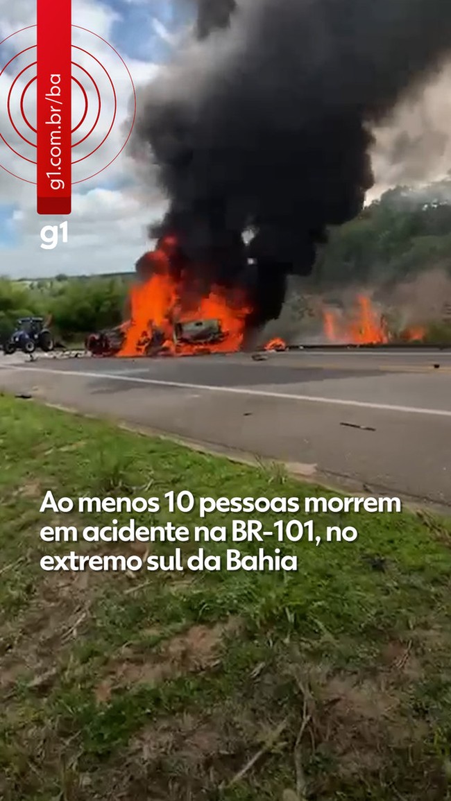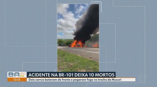Dez pessoas morreram em uma colisão entre dois carros neste sábado (27), em um trecho da BR-101, que fica na cidade de Mucuri, no extremo sul da Bahia. Uma outra pessoa ficou gravemente ferida, segundo a Polícia Rodoviária Federal (PRF).