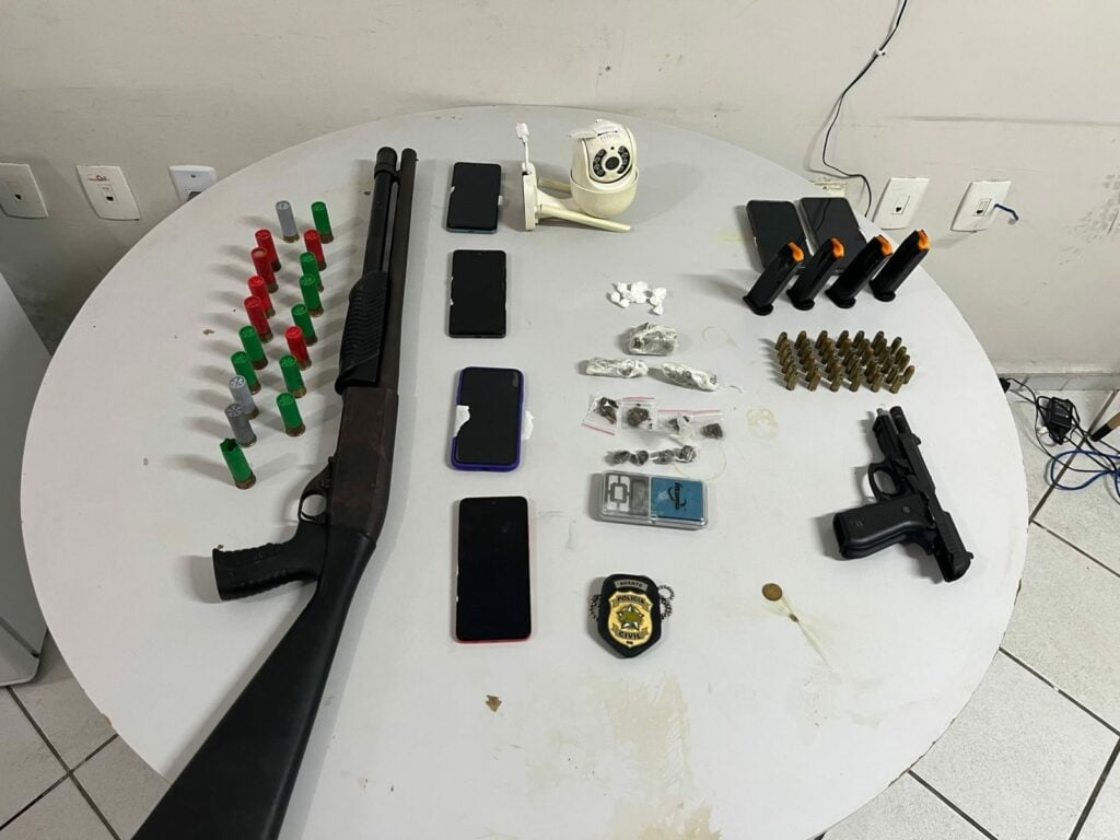 A operação também resultou na apreensão de entorpecentes, armas e munições de grosso calibre, além da autuação em flagrante de suspeitos durante o cumprimento das diligências.